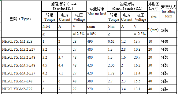 NH90LYX series brushless torque motor performance indicators