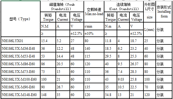 NH186LYX series brushless torque motor performance indicators