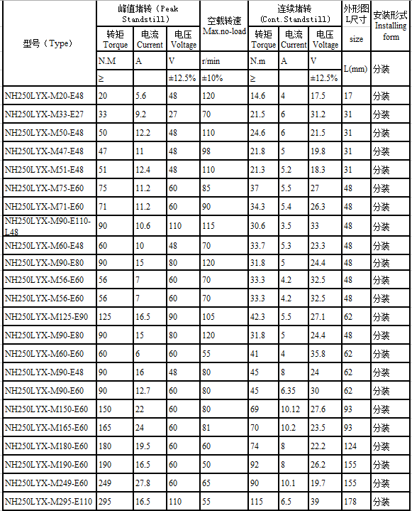 NH250LYX series brushless torque motor performance indicators